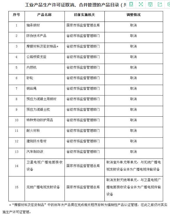 經(jīng)研究論證,國務(wù)院決定,壓減工業(yè)產(chǎn)品生產(chǎn)許可證管理目錄,取消內(nèi)燃機、汽車制動液等13類工業(yè)產(chǎn)品生產(chǎn)許可證管理,將衛(wèi)星電視廣播地面接收設(shè)備與無線廣播電視發(fā)射設(shè)備2類產(chǎn)品壓減合并為1類,對其中涉及安全、健康、環(huán)保的,轉(zhuǎn)為強制性產(chǎn)品認證管理,認證費用由財政負擔。調(diào)整后繼續(xù)實施工業(yè)產(chǎn)品生產(chǎn)許可證管理的產(chǎn)品共計10類,其中,由國家市場監(jiān)督管理總局實施的5類,由省級市場監(jiān)督管理部門實施的5類。