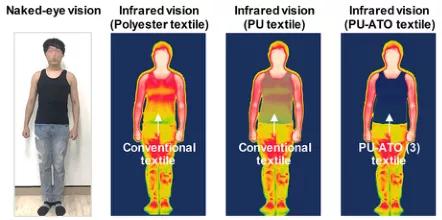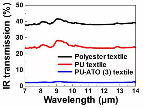 韓國京畿道大學(xué)Sang-Mi Jeong等研究人員成功合成了聚氨酯-銻錫氧化物(PU-ATO)復(fù)合纖維,與常規(guī)的聚酯或PU織物相比,本研究開發(fā)的PU-ATO復(fù)合纖維紡織品具有出色的IR和熱輻射屏蔽性能,即使暴露于?20°C和+80°C的重復(fù)溫度變化以及30天的長期溫度變化的十個(gè)循環(huán)中,制成的PU–ATO復(fù)合纖維仍具有穩(wěn)定的IR和熱輻射屏蔽性能。PU-ATO復(fù)合纖維的表面被制成疏水性,以防止由于PU-ATO復(fù)合纖維被吸收的水潤濕而導(dǎo)致IR和熱輻射變形。