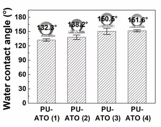 由于纖維吸水會導(dǎo)致IR圖像變形,纖維的疏水性對于保持一定水平的紅外和熱輻射屏蔽能力至關(guān)重要。使用接觸角分析儀評估該復(fù)合纖維的水潤濕性。如圖4所示,不同濃度(0.5、1.5、3.0和4.0 mmol)的PU-ATO(1-4)復(fù)合纖維的水接觸角均≥130°,顯示出疏水性,因此,織物表面上的水滴沒有被吸收,而是易于滾落。