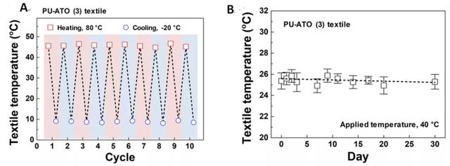 圖5 根據(jù)溫度和時(shí)間的變化,反復(fù)評估PU–ATO(3)復(fù)合紡織品的紅外和熱輻射屏蔽性能。A, 經(jīng)過反復(fù)加熱(+80°C)和冷卻(?20°C)循環(huán) PU–ATO(3)復(fù)合紡織品的表面溫度。B, 每天施加40°C的溫度8小時(shí)(共30天)后,PU–ATO(3)復(fù)合紡織品的表面溫度