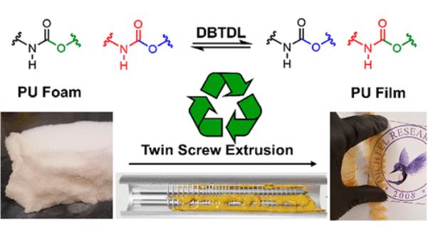 近期,西北大學的William R. Dichtel教授將二月桂酸二丁基錫(DBTDL)引入交聯的PU泡沫中,通過動態氨基甲酸酯交換反應使泡沫具有可塑性,然后使用雙螺桿擠出機去除泡沫中的空氣,形成一種比原PU泡沫價值更高的材料,這種材料具有較強重塑性,可加工成堅硬耐用的塑料或柔軟彈性的薄膜,用于汽車保險杠、表帶、購物車或滑板輪等產品。這項技術將使商用PU廢料進一步回收利用,并推動其他熱固性材料再處理的進一步發展!