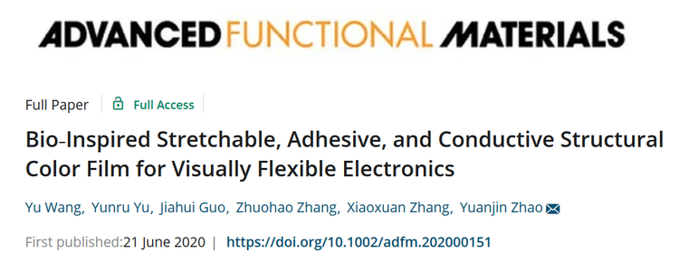 最近, 東南大學(xué)趙遠(yuǎn)錦教授在《 Advanced Functional Materials》上發(fā)表了題為“ Bio‐Inspired Stretchable, Adhesive, and Conductive Structural Color Film for Visually Flexible Electronics”的文章,他們從 貽貝的粘附特性和 變色龍的變色機(jī)理出發(fā),提出了一種 新穎的碳納米管-聚多巴胺(PDA)和彈性聚氨酯(PU)聚合物雜化的結(jié)構(gòu)色薄膜,用于可視化柔性電子。他們將導(dǎo)電CNTs-PDA填料引入彈性PU反蛋白石支架中,由于PU層具有良好的柔韌性和反蛋白石結(jié)構(gòu),使其具有穩(wěn)定的拉伸性能和明亮的結(jié)構(gòu)色彩。此外,由于PDA上含有鄰苯二酚基團(tuán),使薄膜具有較高的組織粘附性和自愈能力,CNTs的引入使薄膜具有良好的導(dǎo)電性。該薄膜 在拉伸過程中具有變色和機(jī)電特性,可作為雙信號柔性人體運動傳感器,用于 實時彩色傳感和電信號監(jiān)測。這些特性表明,混合導(dǎo)電結(jié)構(gòu)色薄膜可以提高柔性電子學(xué)的實用價值。