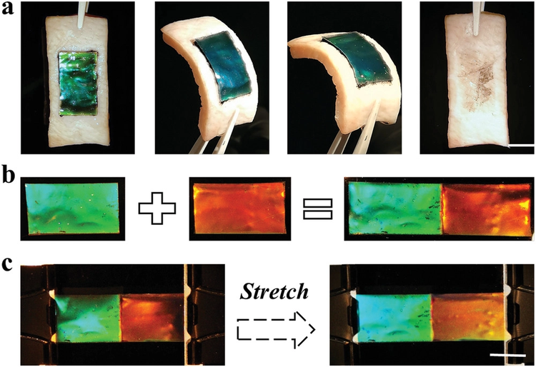 圖3 雜化薄膜的附著力和自愈性。a) 高分子導(dǎo)電水凝膠雜化結(jié)構(gòu)色薄膜在豬皮膚上逐漸彎曲的照片。b) 兩段混合結(jié)構(gòu)彩色膜的自愈合過程。c) 混合結(jié)構(gòu)色膜的機(jī)械響應(yīng)變色能力。