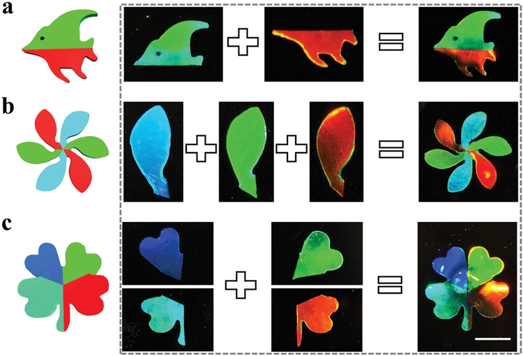 通過使用模板成型方法,可以容易地以不同的模式設(shè)計薄膜,例如 魚、六葉花和四瓣三葉草。在這一過程中,首先產(chǎn)生具有不同結(jié)構(gòu)色的雜化膜。基于上述自愈特性,這些片段可以粘合在一起,形成一個完整的物體。這些復(fù)雜的圖案薄膜使其成為 不同領(lǐng)域的功能材料。