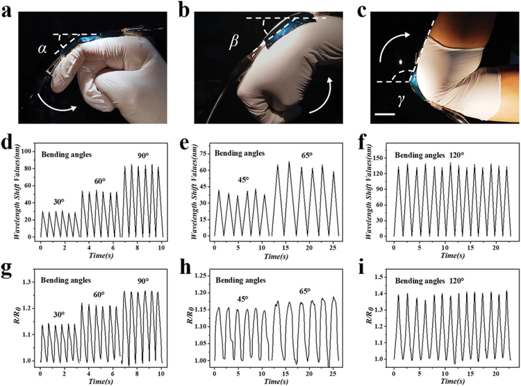 圖5 電導(dǎo)率對各種實時人體運動的響應(yīng)。a-c)分別對a)手指、b)手腕和c)肘部的彎曲運動響應(yīng)的聚合物導(dǎo)電水凝膠混合結(jié)構(gòu)色膜的照片。α、 β和γ分別表示手指、手腕和肘部彎曲運動的彎曲角度。d-f)薄膜的波長偏移值,分別對應(yīng)于d)手指、e)手腕和f)肘部的不同彎曲角度。g-i)混合結(jié)構(gòu)色膜的相對電阻隨g)手指、h)手腕和i)肘部的不同角度而變化。